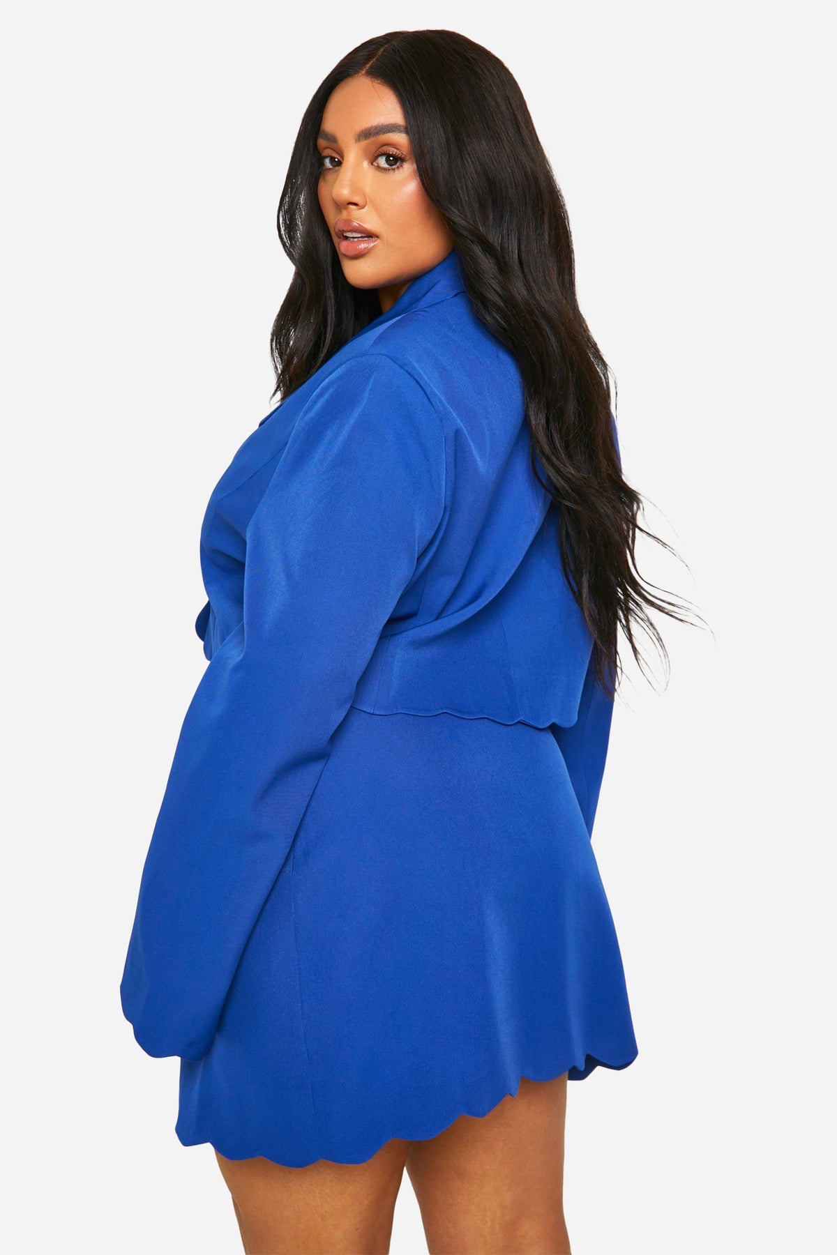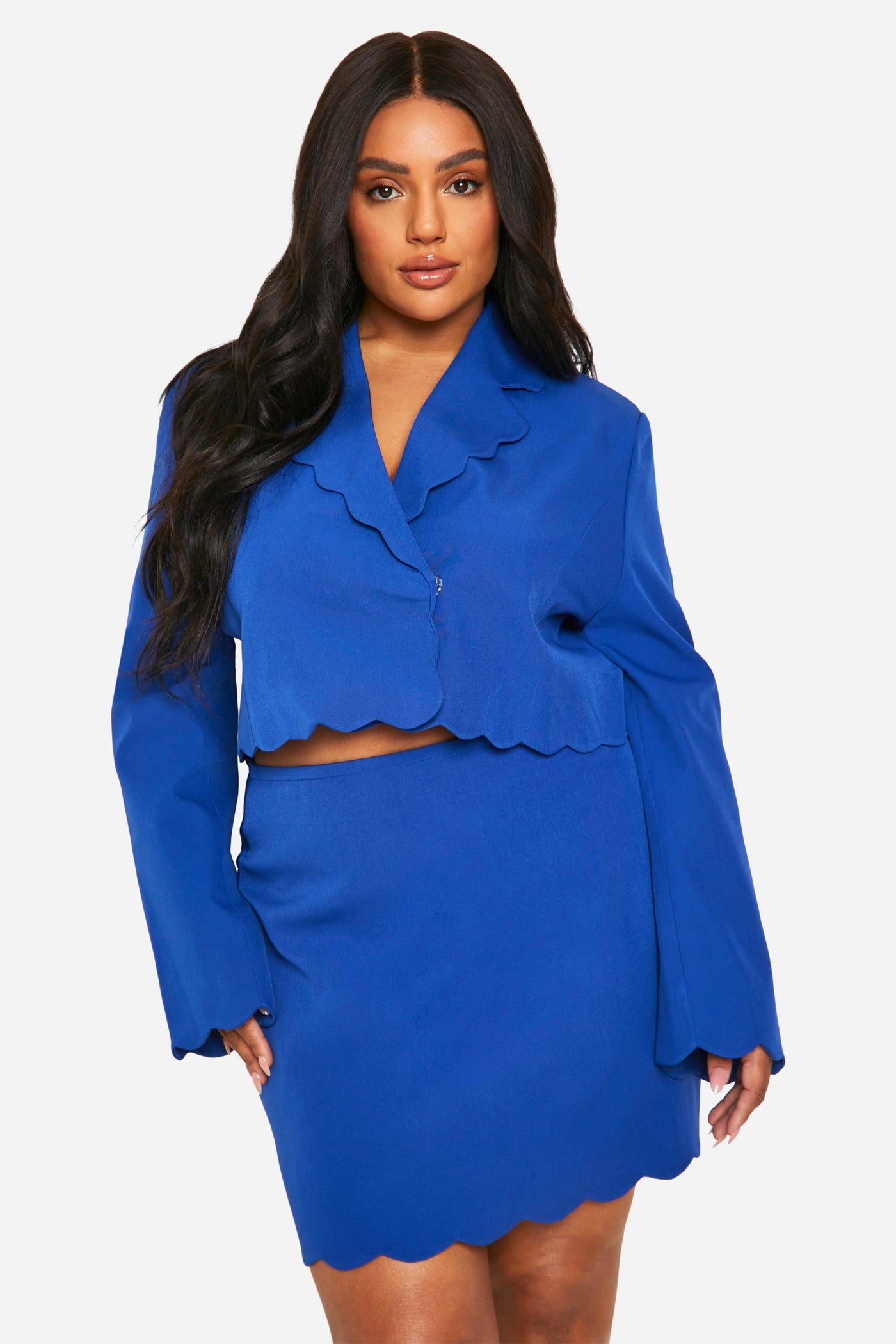 Make a bold statement with this striking two-piece ensemble. The mini skirt features a playful scalloped hem that adds a touch of whimsy to your look, while the high-waisted design accentuates your curves. Paired with the matching crop top, complete with a smart notched lapel collar and long sleeves, this co-ord set is perfect for a night out on the town. Style it with strappy heels and statement earrings for a head-turning ensemble that's sure to turn heads at the club. For a more casual vibe, throw on a leather jacket and ankle boots. This versatile set can easily transition from drinks with the girls to dancing the night away, making it a must-have addition to your going-out wardrobe.Discover Plus Scallop Mini Skirt available to buy online at us.boohoo.com. Available with quick delivery and easy return options. Shop now!Discover Plus Scallop Mini Skirt available to buy online at us.boohoo.com. Available with quick delivery and easy return options. Shop now!
