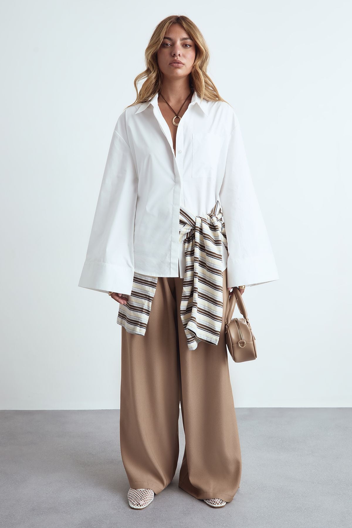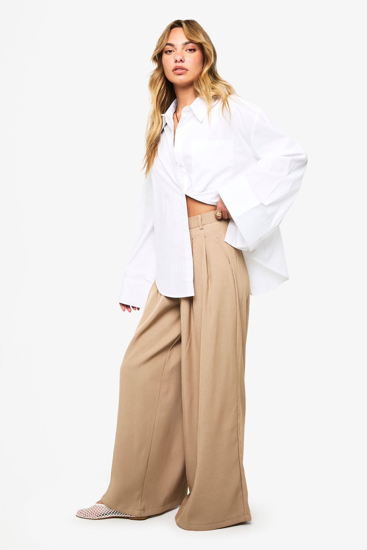 Make a bold statement with these striking wide leg trousers from Boohoo. The dramatic flowing silhouette creates movement with every step while the high-waisted design flatters your figure beautifully. Style them as shown with an oversized white shirt and neutral accessories for an effortlessly chic daytime ensemble, or dress them up with a fitted bodysuit and heels for evening drinks. The front pleating adds a tailored touch that brings sophistication to the relaxed wide-leg shape. Perfect for family gatherings or casual workplace settings, these trousers offer both comfort and style in equal measure. The flowing fabric creates a graceful drape that works wonderfully with both fitted and loose tops, making these trousers a versatile addition to your wardrobe that can be styled countless ways throughout the seasons.Discover Tailored Pleated Wide Leg Trousers available to buy online at us.boohoo.com. Available with quick delivery and easy return options. Shop now!Discover Tailored Pleated Wide Leg Trousers available to buy online at us.boohoo.com. Available with quick delivery and easy return options. Shop now!