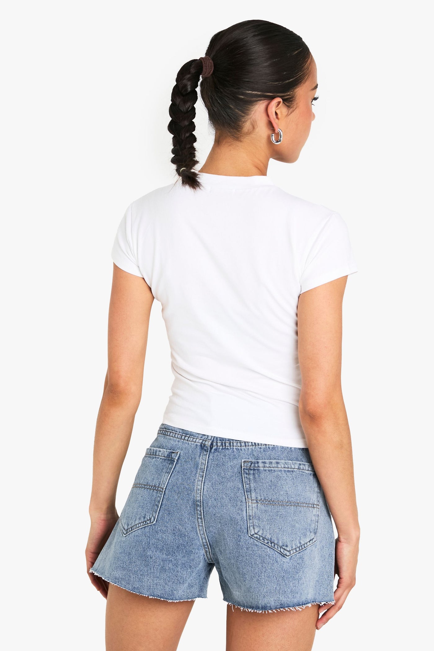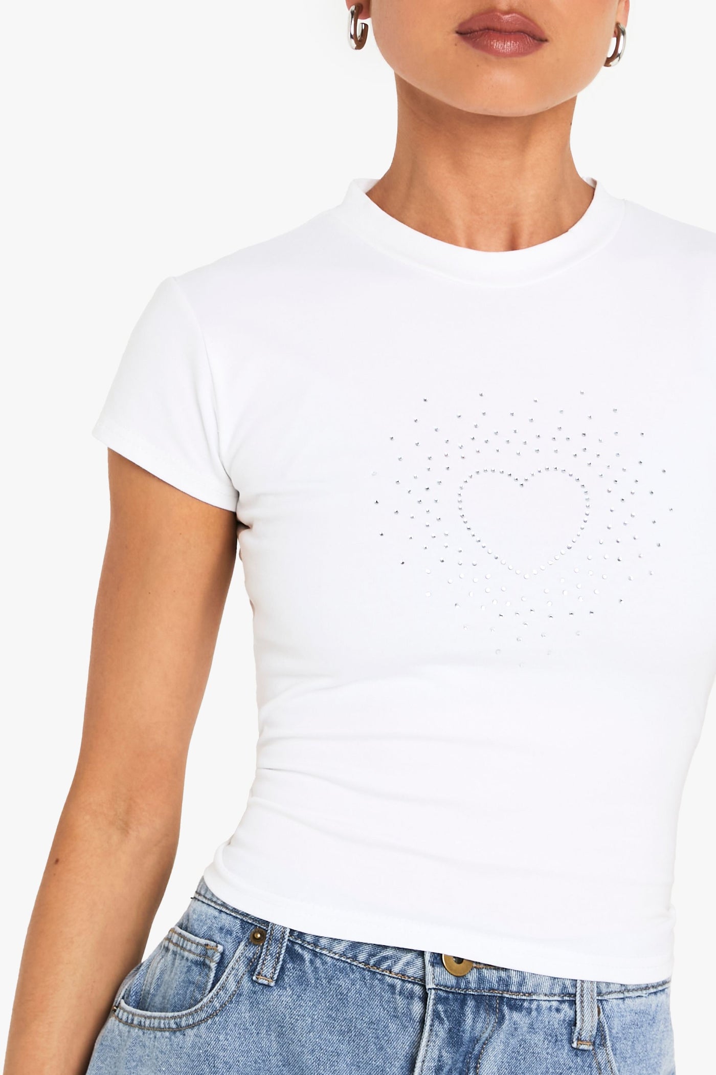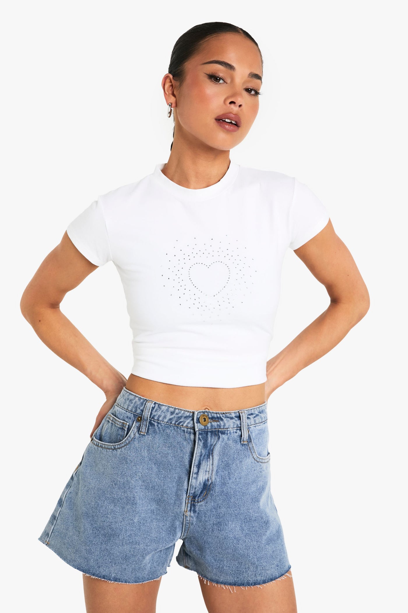 This charming baby t-shirt brings a playful touch to your casual wardrobe with its sweet heart detailing. The cropped length creates a contemporary silhouette that pairs brilliantly with high-waisted denim shorts, as styled on our model, or your favourite mum jeans for a relaxed weekend look. The fitted design accentuates your figure whilst the soft cotton fabric ensures comfort throughout the day. Style with trainers and a crossbody bag for daytime coffee dates, or dress up with a leather jacket and boots for evening drinks with the girls. For family gatherings, layer under dungarees or team with a flowing midi skirt for a balanced silhouette. This versatile piece transitions effortlessly from casual outings to laid-back social events, making it an essential addition to your everyday collection.Discover Heart Hotfix Printed Baby T-shirt available to buy online at us.boohoo.com. Available with quick delivery and easy return options. Shop now!Discover Heart Hotfix Printed Baby T-shirt available to buy online at us.boohoo.com. Available with quick delivery and easy return options. Shop now!