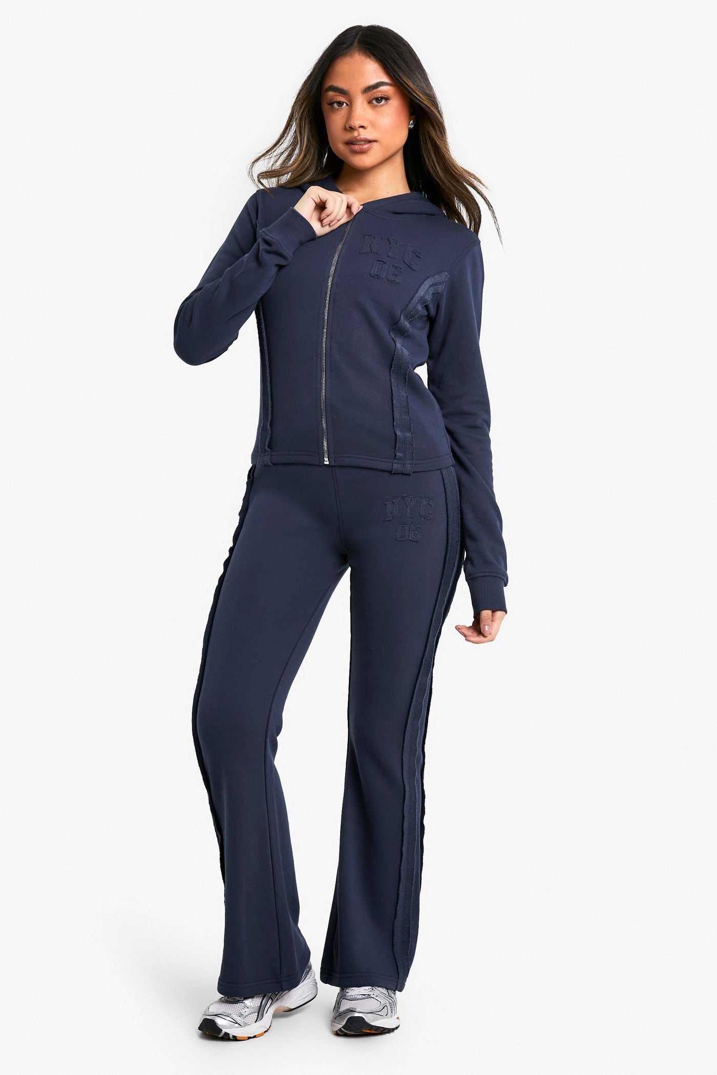 Embrace casual chic with this trendy tracksuit, featuring an eye-catching NYC appliqu that adds a touch of metropolitan charm. The full-length zip-up hoodie offers adaptable wear, allowing you to adjust your look to suit the weather or your mood. Pair with trainers for a laid-back day out or dress up with statement jewellery for a more polished casual ensemble. Ideal for family gatherings, weekend brunches, or lounging at home, this tracksuit combines comfort with style. The wide-leg trousers provide a relaxed fit, perfect for all-day wear, while the thumb holes in the sleeves offer extra cosiness and a contemporary edge. Mix and match the pieces with other wardrobe staples to create multiple looks, from athleisure to smart-casual, making this tracksuit a versatile addition to your wardrobe.Discover NYC Applique Zip Through Shrunken Tracksuit available to buy online at us.boohoo.com. Available with quick delivery and easy return options. Shop now!Discover NYC Applique Zip Through Shrunken Tracksuit available to buy online at us.boohoo.com. Available with quick delivery and easy return options. Shop now!