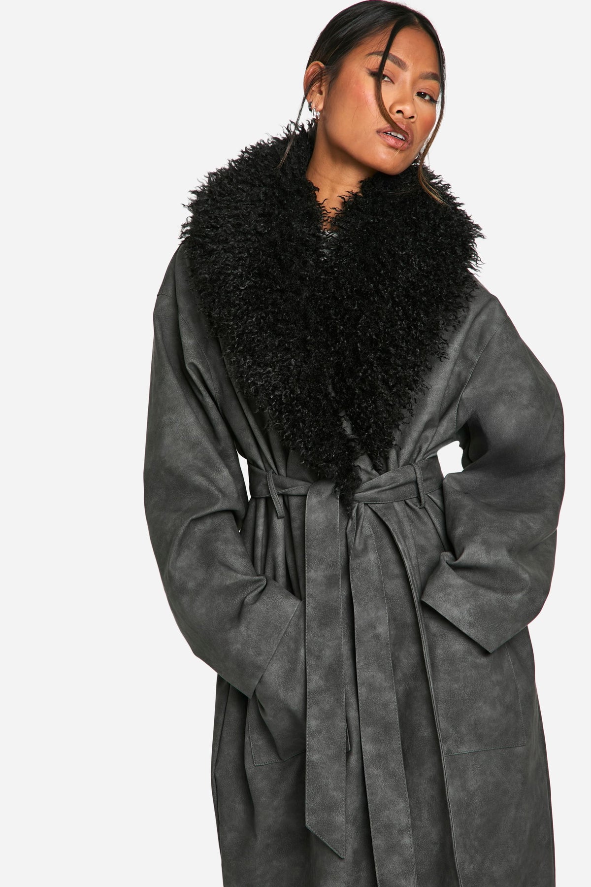 Make a bold statement with this vintage-inspired trench coat, perfect for those chilly nights out. The oversized silhouette creates a dramatic look, while the faux fur collar adds a touch of glamour. Style it over a crop top and wide-leg trousers for a night at the club, or pair it with a sleek bodycon dress for drinks with friends. The belted waist allows you to cinch in your silhouette or leave it loose for a more relaxed vibe. This versatile piece can easily transition from day to night, making it a must-have addition to your wardrobe. Whether you're heading to a trendy bar or meeting new people in the city, this coat will ensure you stand out from the crowd while keeping you warm and stylish.Discover Faux Fur Collar Vintage Look Faux Leather Trench Coat available to buy online at us.boohoo.com. Available with quick delivery and easy return options. Shop now!Discover Faux Fur Collar Vintage Look Faux Leather Trench Coat available to buy online at us.boohoo.com. Available with quick delivery and easy return options. Shop now!