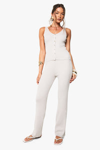 Sleek knitted co-ord featuring a button-through vest top and wide-leg trousers