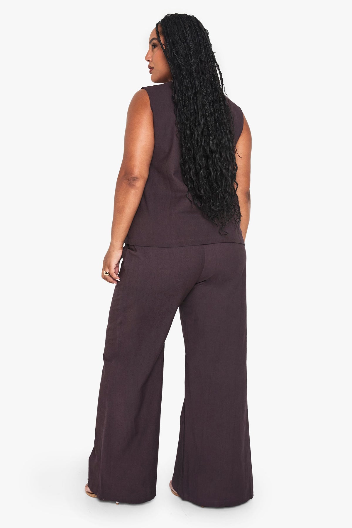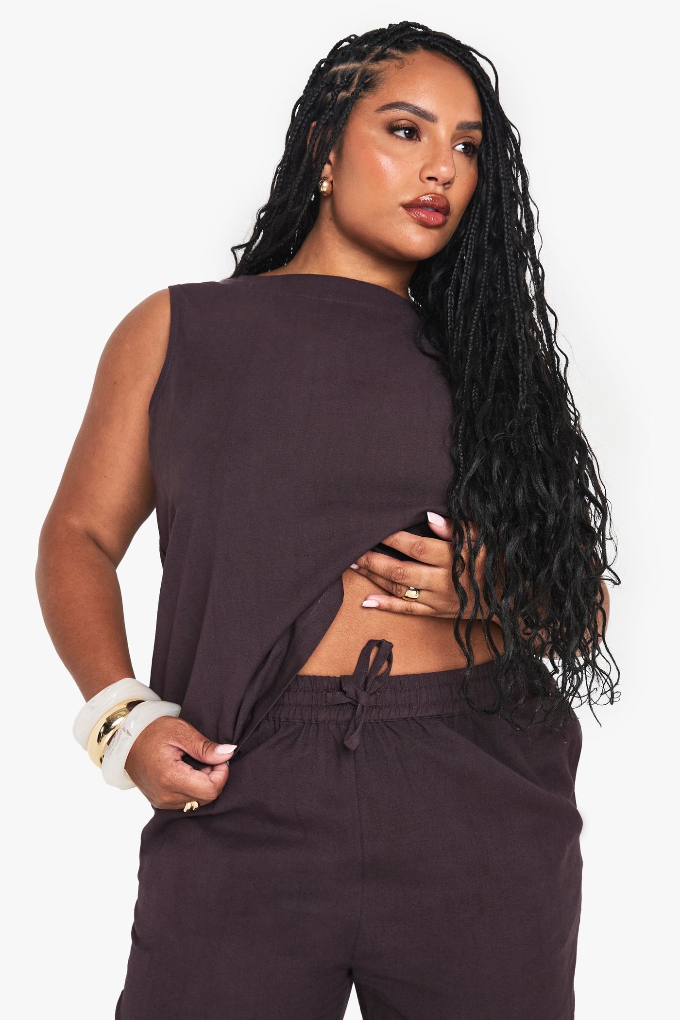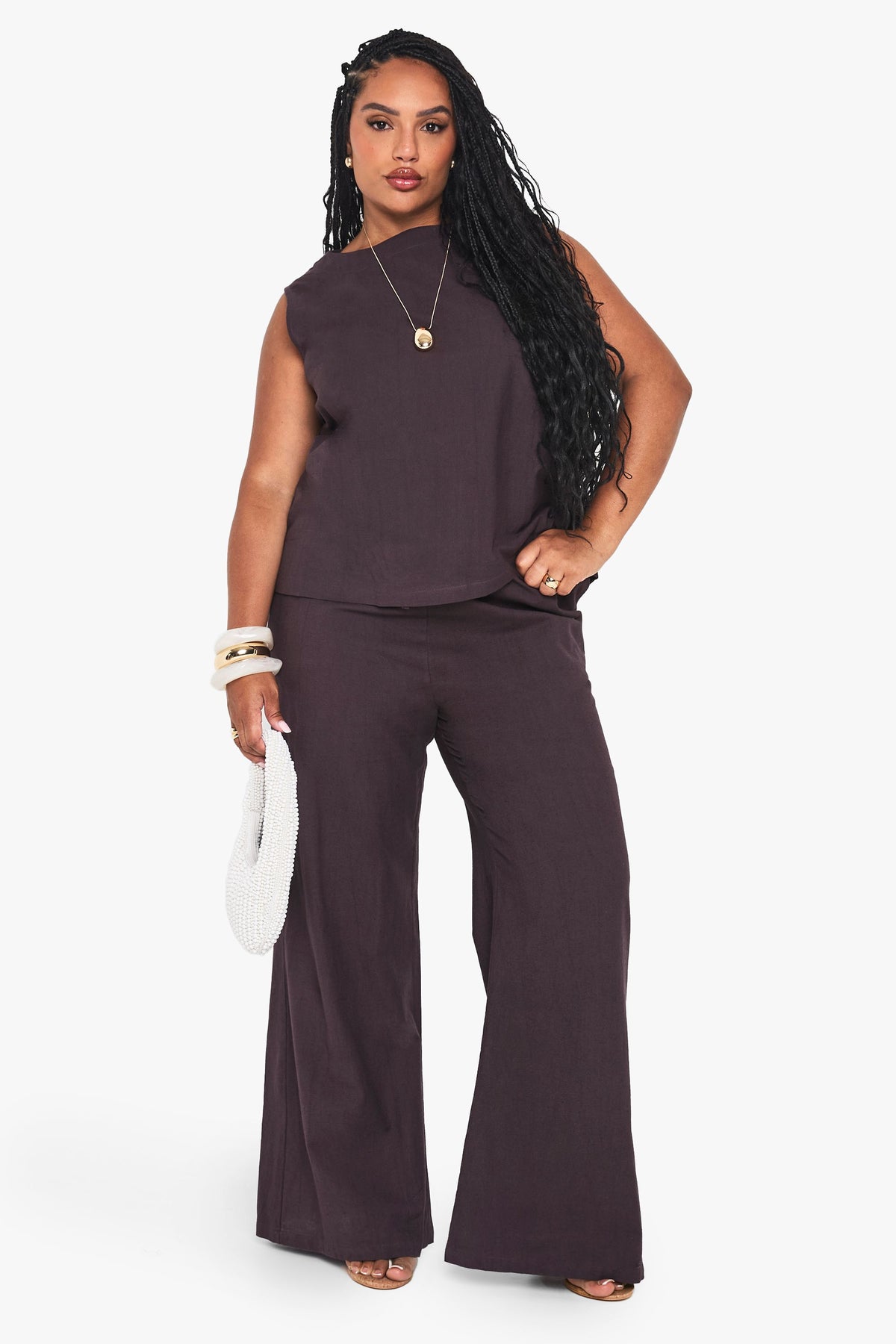This chic plus size co-ord set combines contemporary style with laid-back comfort. The sleeveless high neck top offers a sophisticated touch whilst maintaining a relaxed feel, whilst the wide leg trousers with drawstring detail create a flattering silhouette with customisable comfort. As seen on our model, pair with minimalist jewellery and a small handbag for an effortlessly stylish daytime look. The linen fabric drapes beautifully and provides breathability, making this set ideal for casual gatherings, weekend brunches or holiday escapes. For cooler evenings, layer with a lightweight cardigan or denim jacket. The versatility of this Boohoo co-ord allows for mixing and matching with other wardrobe staples - try the top with jeans or the trousers with a fitted tee for extended styling options. Perfect for the fashion-forward woman who values both comfort and trend-led style.Discover Plus High Neck Sleeveless Top And Drawstring Wide Leg Trousers Co-ord available to buy online at us.boohoo.com. Available with quick delivery and easy return options. Shop now!Discover Plus High Neck Sleeveless Top And Drawstring Wide Leg Trousers Co-ord available to buy online at us.boohoo.com. Available with quick delivery and easy return options. Shop now!
