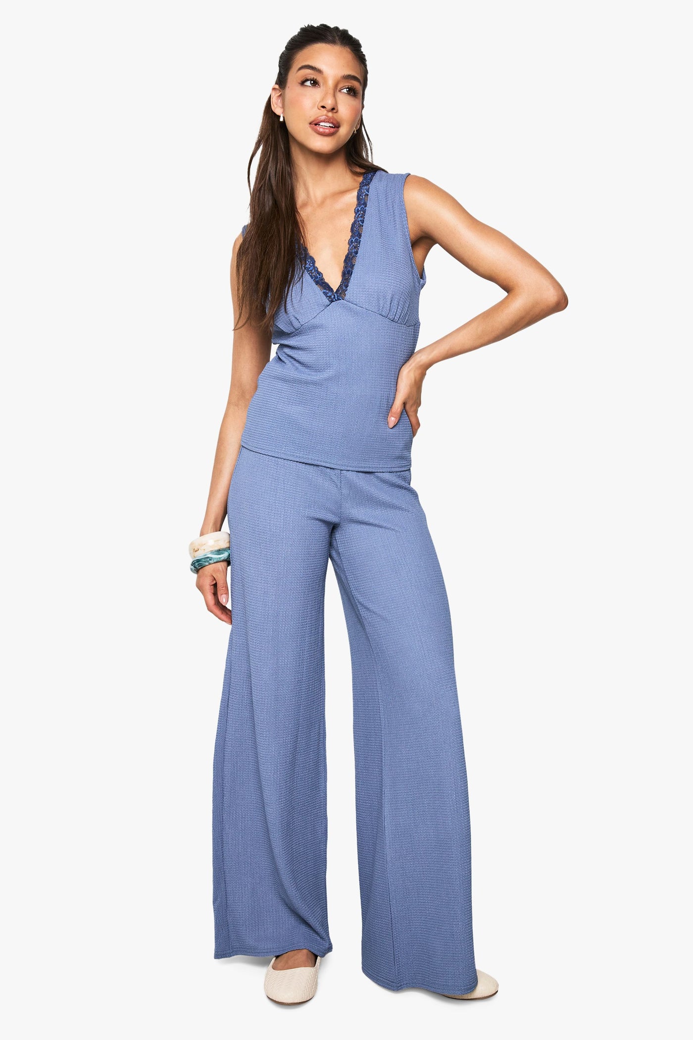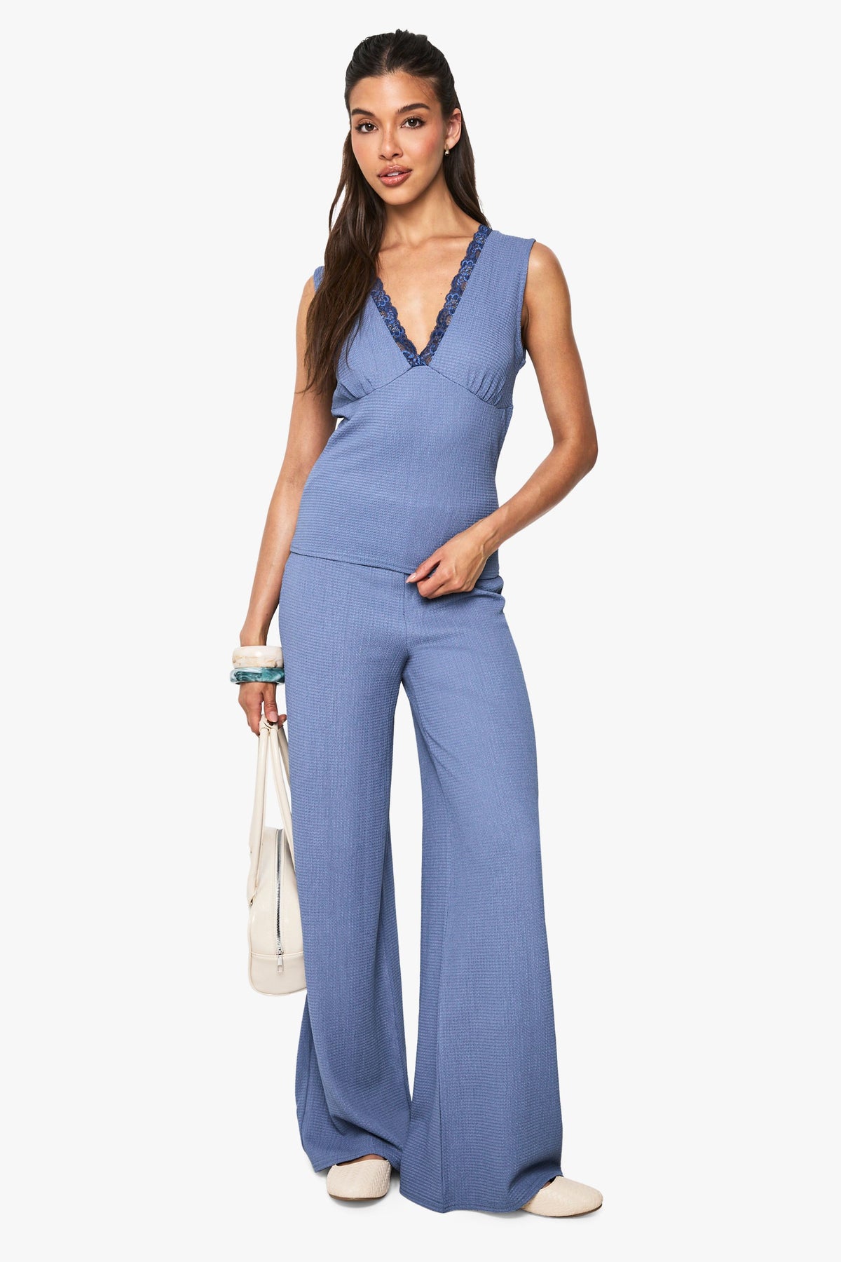 This chic textured co-ord combines comfort with contemporary style for versatile daywear. The V-neck top features beautiful lace trim detailing that adds a subtle feminine element, whilst the wide leg trousers create a flowing silhouette that's both on-trend and flattering. Style with trainers and a canvas tote for casual weekend brunches, or dress up with statement jewellery and flat sandals for family gatherings. The coordinated set works brilliantly together, but each piece can also be mixed with your existing wardrobe staples - pair the top with your favourite jeans or team the trousers with a simple camisole. The textured fabric adds visual interest while maintaining a relaxed feel, making this Boohoo co-ord the perfect addition to your casual collection for those moments when you want to look effortlessly put-together.Discover Textured Lace Trim V Neck Top and Wide Leg Trouser Co-ord available to buy online at us.boohoo.com. Available with quick delivery and easy return options. Shop now!Discover Textured Lace Trim V Neck Top and Wide Leg Trouser Co-ord available to buy online at us.boohoo.com. Available with quick delivery and easy return options. Shop now!