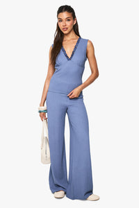 Textured V-neck top with delicate lace trim detailing for a feminine touch