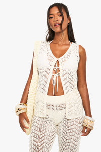 This eye-catching crochet waistcoat brings bohemian charm to your casual wardrobe. The open-knit design creates a beautiful textural contrast when layered over a simple vest top or bandeau for daytime outings. Style with the matching crochet trousers as seen on our model for a coordinated beach-ready ensemble, or pair with denim shorts and trainers for festival vibes. The front tie detail allows you to adjust the fit to your preference, making it versatile for various occasions. Perfect for family barbecues, beach holidays or casual coffee dates with friends. Accessorise with wooden bangles and a roomy tote bag to complete the laid-back look. This waistcoat transitions effortlessly from daytime casual to evening drinks when styled with the right accessories.Discover Crochet Tie Waistcoat available to buy online at us.boohoo.com. Available with quick delivery and easy return options. Shop now!Discover Crochet Tie Waistcoat available to buy online at us.boohoo.com. Available with quick delivery and easy return options. Shop now!