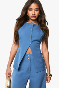 Make a striking statement with this fashion-forward weste, designed to turn heads on your next night out. The tailored fit creates a polished silhouette whilst the asymmetric button detail and daring front split add contemporary edge to this versatile piece. Style as seen with the matching wide-leg trousers for a coordinated ensemble that commands attention, or pair with high-waisted jeans and strappy heels for a more casual approach to evening dressing. Complete the look with statement gold jewellery and a compact clutch as shown by our model. Perfect for cocktails with the girls, club nights or any occasion where you want to showcase your fashion credentials. The sleek, minimalist design ensures this piece will remain a go-to in your going-out wardrobe for seasons to come.Discover Gold Button Open Front Waistcoat available to buy online at us.boohoo.com. Available with quick delivery and easy return options. Shop now!Discover Gold Button Open Front Waistcoat available to buy online at us.boohoo.com. Available with quick delivery and easy return options. Shop now!