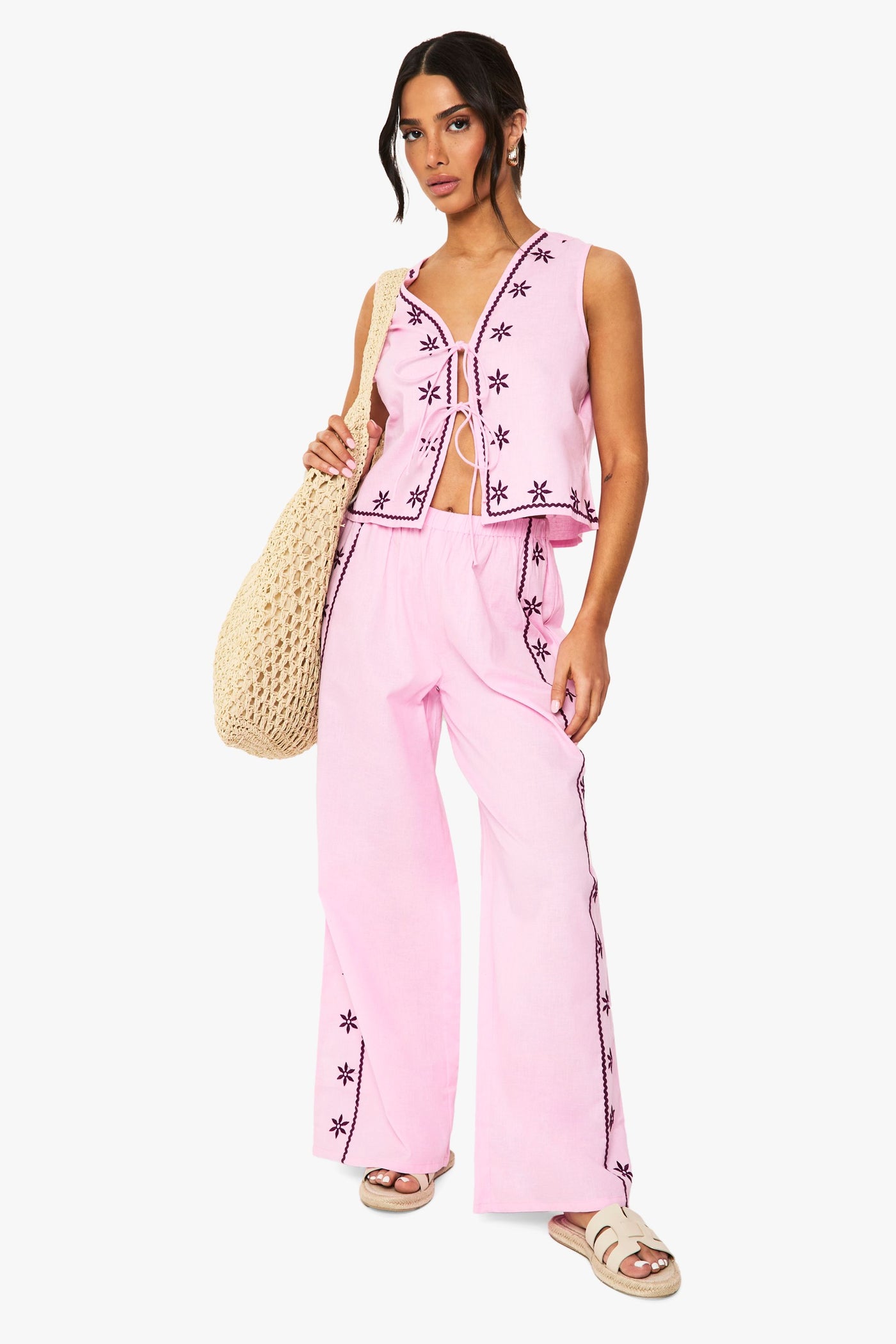 This charming petite waistcoat brings bohemian flair to your summer wardrobe. The boxy silhouette offers a relaxed fit that's ideal for warm-weather styling, while the delicate floral embroidery adds artisanal character to this cotton piece. Style with the matching wide-leg trousers as seen on our model for a coordinated festival-ready ensemble, or pair with denim shorts and trainers for casual daytime outings. The versatile design works brilliantly for family gatherings and garden parties - simply add a woven tote and sandals to complete the look. For cooler evenings, layer over a simple tee or lightweight long-sleeve top. The front tie detail allows you to customise your look, whether worn loosely open or secured for a more defined silhouette.Discover Petite Floral Embroidery Waistcoat available to buy online at us.boohoo.com. Available with quick delivery and easy return options. Shop now!Discover Petite Floral Embroidery Waistcoat available to buy online at us.boohoo.com. Available with quick delivery and easy return options. Shop now!
