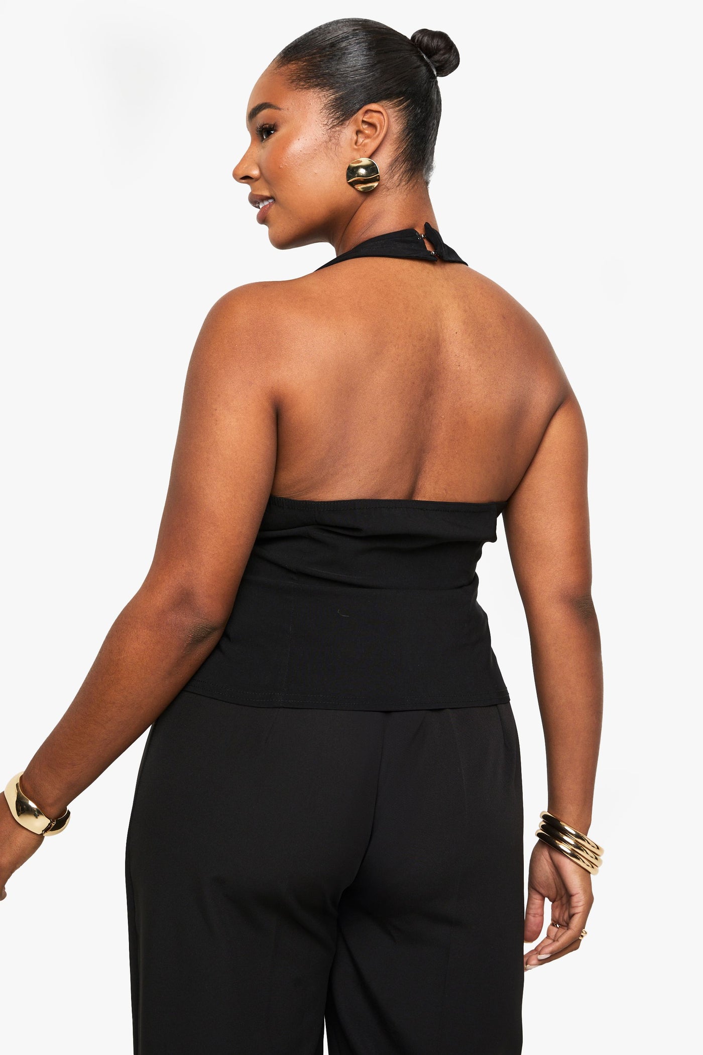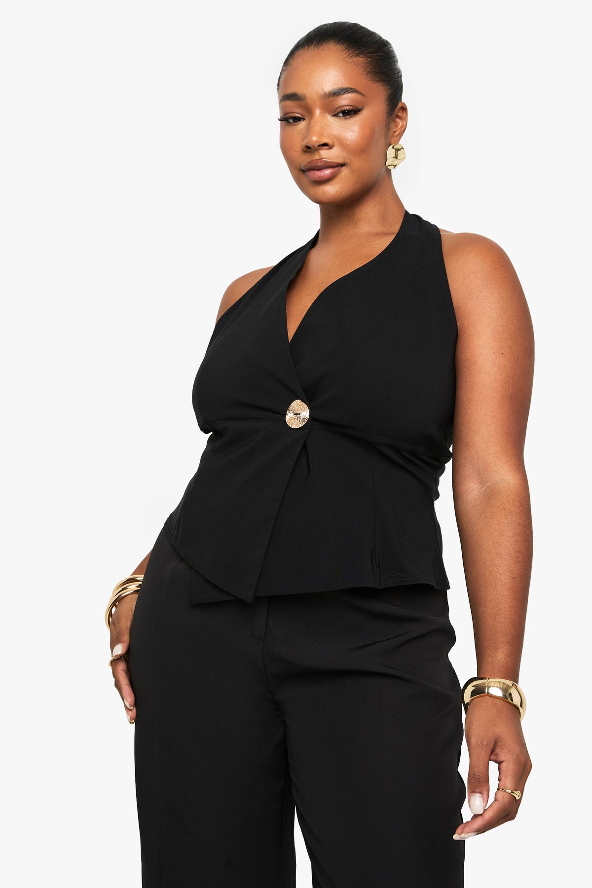 Make a statement on your next night out with this chic halterneck wrap waistcoat. The sophisticated design features a flattering wrap front secured with a standout gold-tone button that adds just the right amount of glamour. Perfect for the confident Boohoo woman who loves to showcase her style, this piece pairs beautifully with wide-leg trousers as shown for a coordinated ensemble that commands attention. Style with statement jewellery and strappy heels for drinks with the girls, or layer over a fitted bodysuit with jeans for a more casual take on nightlife dressing. The open back design offers a sultry touch that's ideal for warm evenings in the city. This versatile top transitions effortlessly from early evening cocktails to late-night dancing, ensuring you remain the centre of attention wherever the night takes you.Discover PLUS HALTER WRAP FRONT GOLD BUTTON WAISTCOAT available to buy online at us.boohoo.com. Available with quick delivery and easy return options. Shop now!Discover PLUS HALTER WRAP FRONT GOLD BUTTON WAISTCOAT available to buy online at us.boohoo.com. Available with quick delivery and easy return options. Shop now!