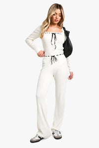 Embrace laid-back chic with this ribbed knit co-ord set, perfect for the fashion-forward woman who values both style and comfort. The contrasting tie details at the neckline and waist add a playful touch to the ensemble, while the square neckline and long sleeves create a flattering frame for your upper body. The wide-leg trousers offer a contemporary silhouette that's both on-trend and easy to wear. Style this set with chunky trainers for a casual day out, or dress it up with heeled boots for a night with friends. The versatility of this two-piece allows for endless styling possibilities - wear them together for a coordinated look or separately to create multiple outfits. Ideal for family gatherings, brunches, or relaxed weekends, this co-ord set is a must-have addition to your wardrobe, embodying the Boohoo spirit of accessible, fun fashion for the young, social butterfly.Discover Contrast Lace Up Detail Rib Knit Co-ord available to buy online at us.boohoo.com. Available with quick delivery and easy return options. Shop now!Discover Contrast Lace Up Detail Rib Knit Co-ord available to buy online at us.boohoo.com. Available with quick delivery and easy return options. Shop now!