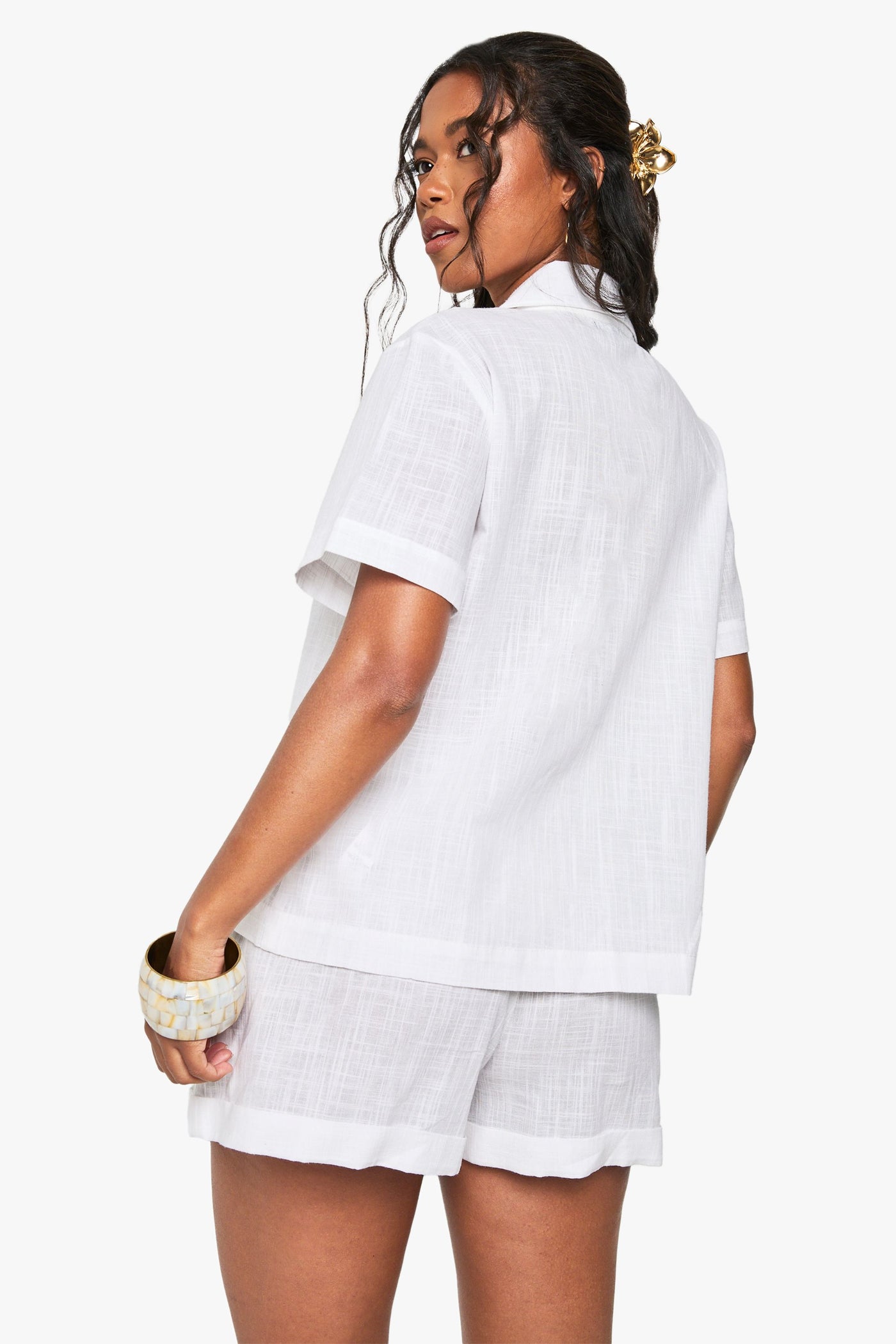 Breezy linen two-piece set featuring a short-sleeved shirt and matching shorts