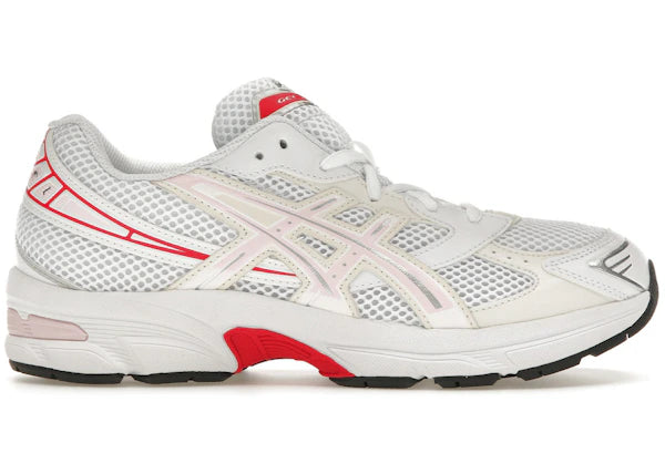 The Pink Salt (GS) ASICS Gel-1130 has an upper made of breathable and flexible white mesh. White and off-white leather overlays with metallic silver accents cross the shoe, forming the toecap, eyestays, and heel supports. The typical ASICS design is formed on each side by these overlays accented with a light Pink Salt color. Gel branding is seen on the heel overlay, which is outlined with a bright red color, while more ASICS branding accented in red is seen on the tongue. The shoe is built with the ASICS signature TRUSSTIC support system, and Gel technology is found underfoot for support and responsiveness. The midsole is white, accented with red at the arch and Pink Salt under the heel.