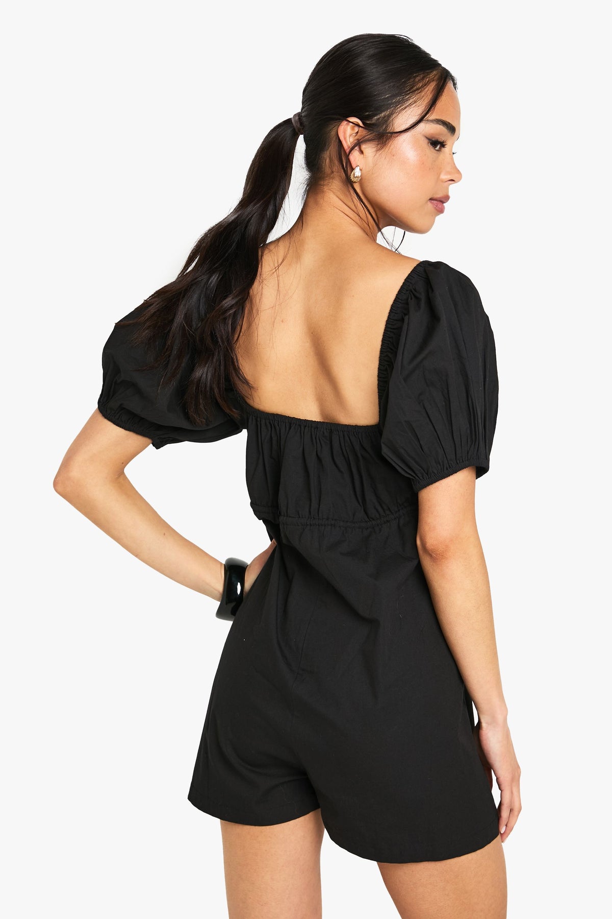 Embrace the perfect blend of comfort and style with this enchanting cotton poplin playsuit. The puff sleeves add a touch of whimsy, while the sweetheart neckline with tie-front detail creates a flattering silhouette. Ideal for casual outings, family gatherings, or relaxed weekend brunches, this playsuit offers both versatility and charm. Style it with trendy trainers and a crossbody bag for a laid-back daytime look, or dress it up with strappy sandals and statement earrings for an evening garden party. The high-waisted design and relaxed fit through the legs ensure all-day comfort without compromising on style. For cooler evenings, layer with a denim jacket or lightweight cardigan to extend its wearability. This playsuit is a must-have addition to your wardrobe, perfect for the fashion-forward woman who values both trend and comfort in her everyday ensembles.Discover Cotton Poplin Puff Sleeve Playsuit available to buy online at us.boohoo.com. Available with quick delivery and easy return options. Shop now!Discover Cotton Poplin Puff Sleeve Playsuit available to buy online at us.boohoo.com. Available with quick delivery and easy return options. Shop now!
