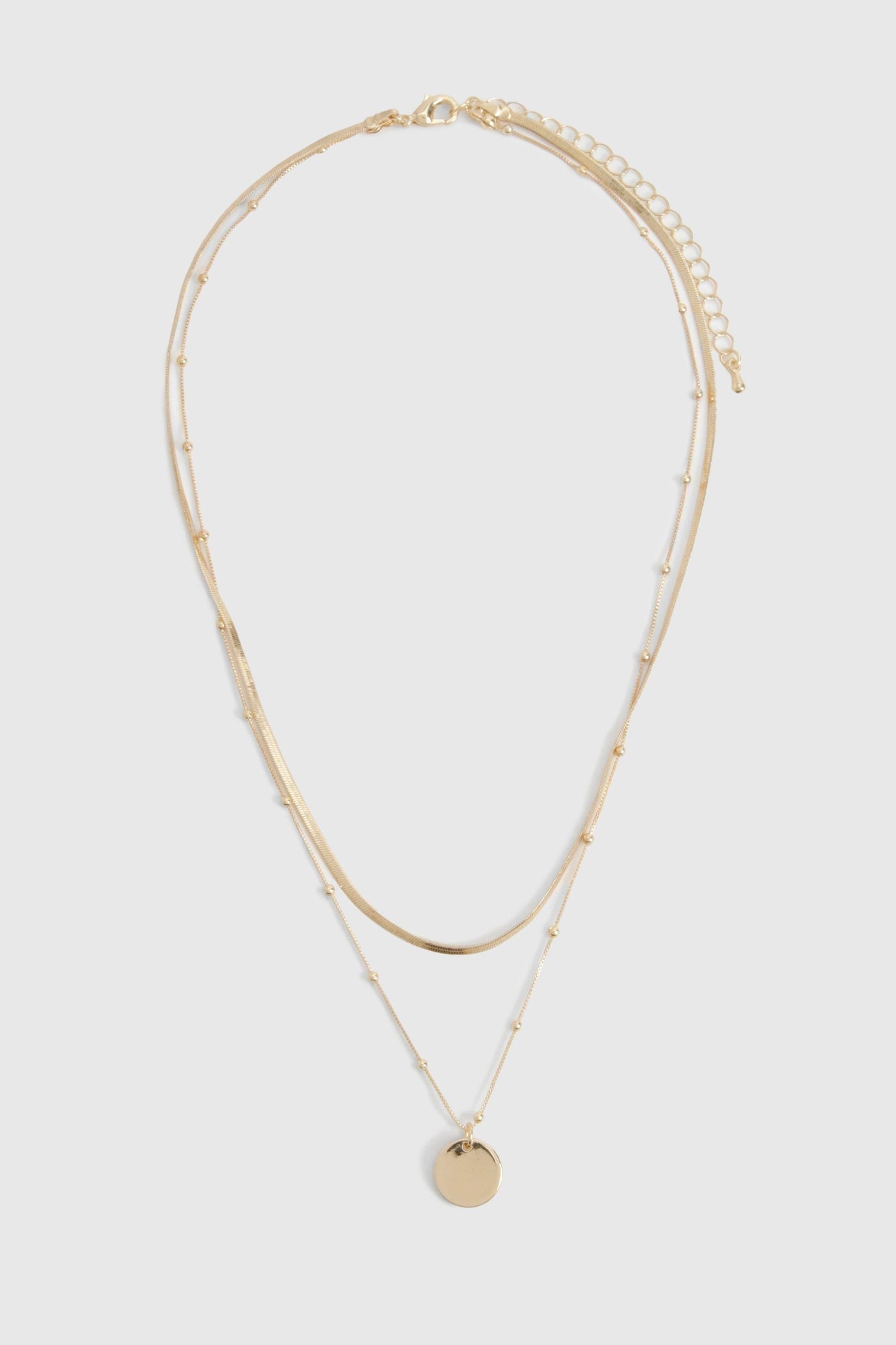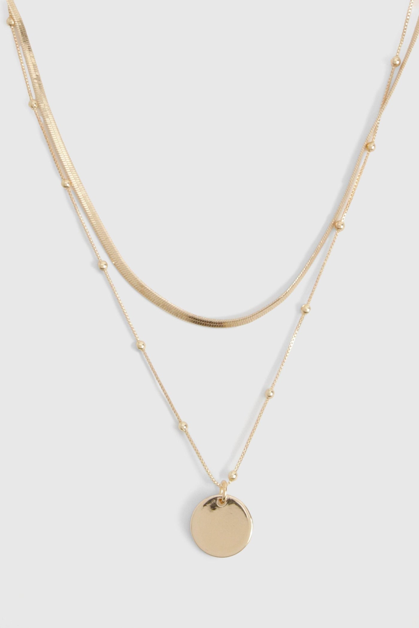 This charming layered necklace is the epitome of effortless chic. The dual-chain design creates depth and interest, while the sleek disc pendant adds a touch of minimalist allure. Perfect for the fashion-forward woman who appreciates versatility, this necklace can be styled with a variety of outfits. Pair it with a V-neck jumper for a cosy yet put-together look, or let it shine against a simple white tee and your favourite denim. The adjustable length allows you to customise the fit, making it suitable for different necklines and occasions. Whether you're meeting friends for brunch or heading to a casual family gathering, this necklace will add a subtle sparkle to your ensemble. Its delicate nature makes it an ideal piece for layering with other necklaces, allowing you to create your own unique style statement.Discover Dainty Gold Layered Pendant Necklace available to buy online at us.boohoo.com. Available with quick delivery and easy return options. Shop now!Discover Dainty Gold Layered Pendant Necklace available to buy online at us.boohoo.com. Available with quick delivery and easy return options. Shop now!