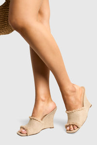 Stylish linen wedge sandals featuring distinctive frayed edges for a textured finish