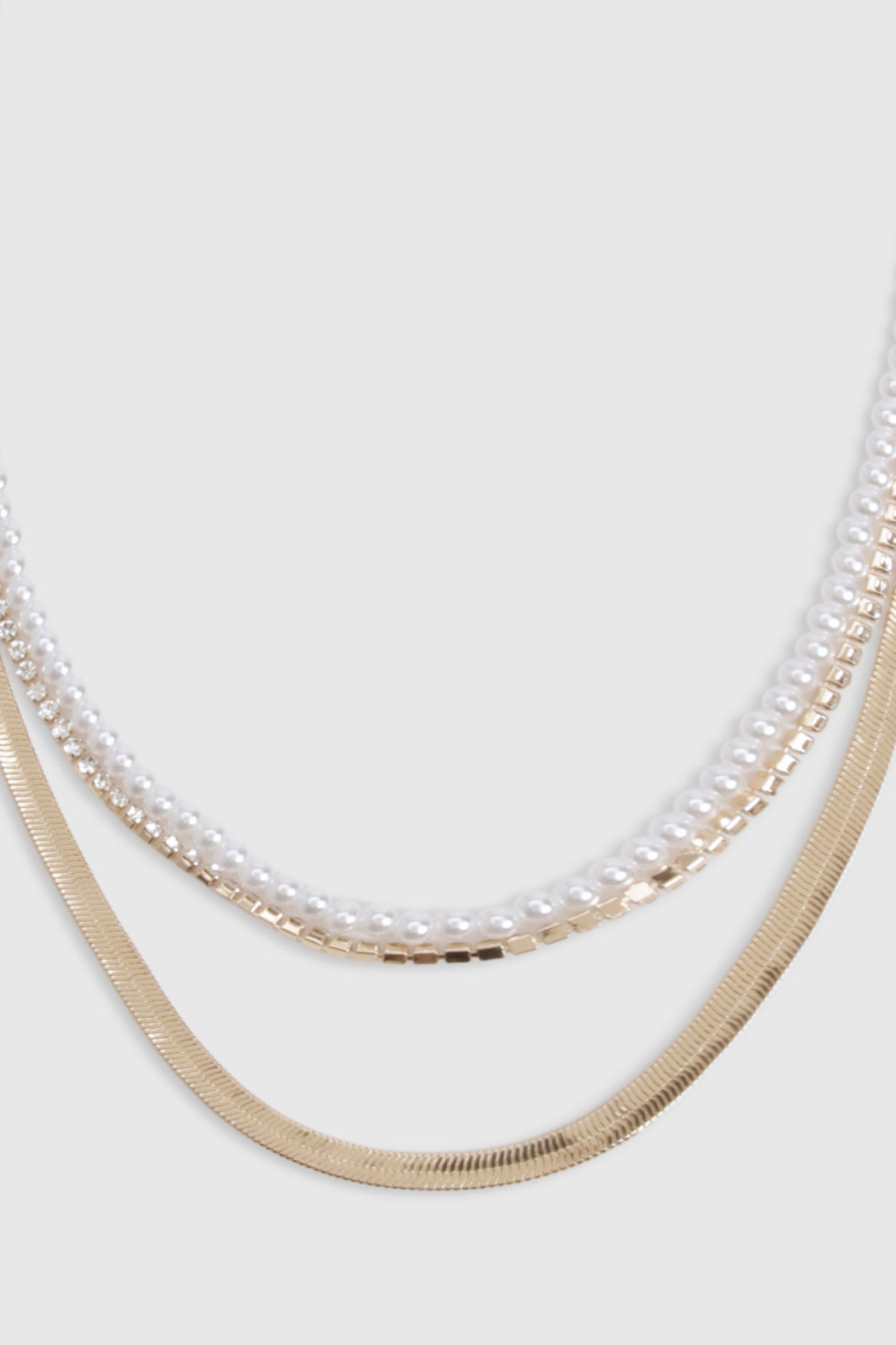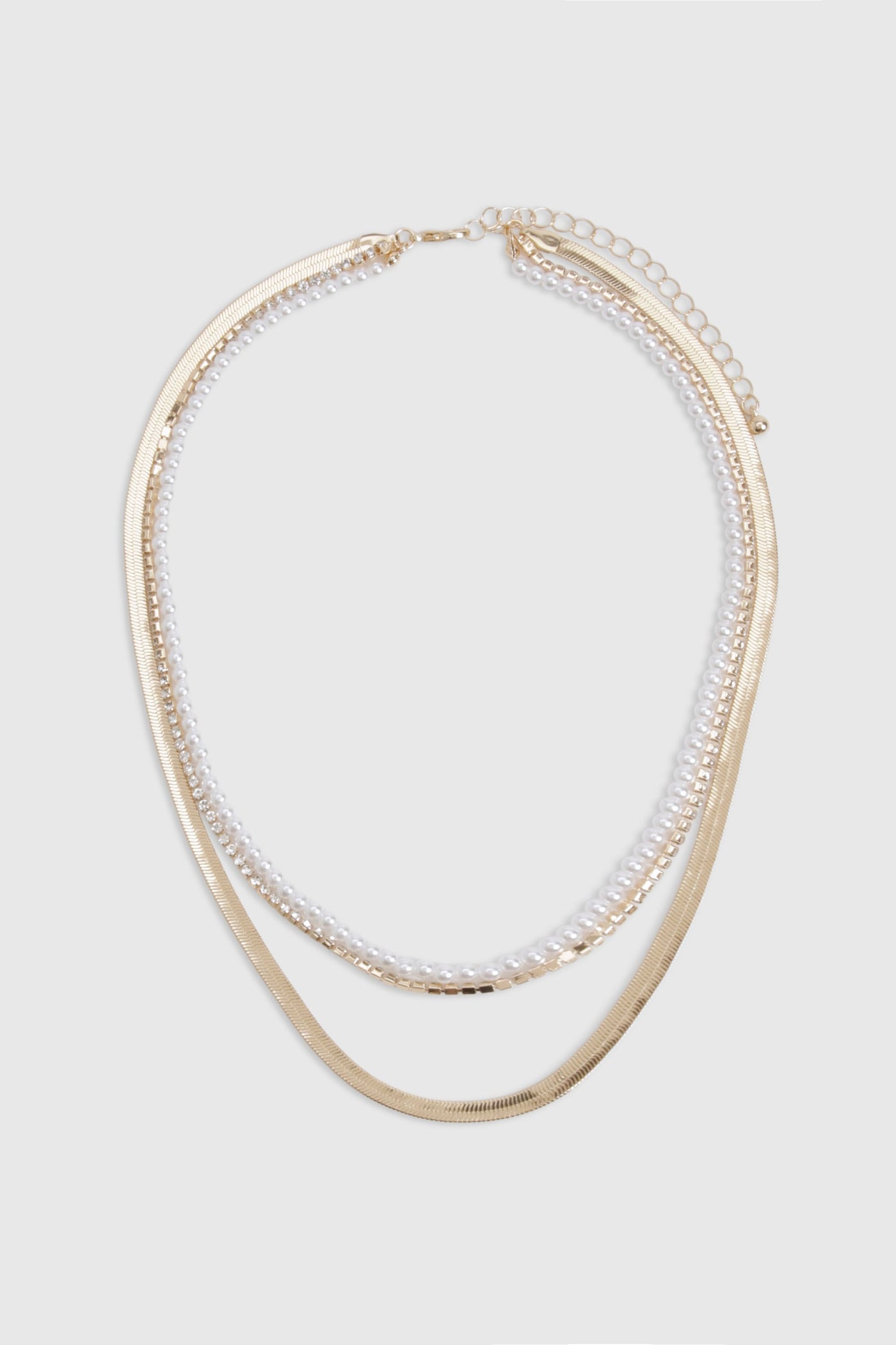 This stunning layered necklace brings together the timeless appeal of pearls with modern metallic elements for a piece that works effortlessly from day to night. The triple-strand design creates dimension and interest, whilst the contrasting textures-from lustrous pearls to glimmering crystals and sleek gold-tone chain-offer a luxe look that appears as though you've carefully curated multiple necklaces. Style with a crisp white blazer for business meetings, or pair with your favourite going-out top and high-waisted jeans for drinks with the girls. The adjustable length allows you to customise the fit, whether you're showcasing it against a plunging neckline or layering over a simple round-neck top. This Boohoo statement piece adds instant polish to any outfit, making it an essential accessory for your collection.Discover Gold Pearl Layered Necklace available to buy online at us.boohoo.com. Available with quick delivery and easy return options. Shop now!Discover Gold Pearl Layered Necklace available to buy online at us.boohoo.com. Available with quick delivery and easy return options. Shop now!