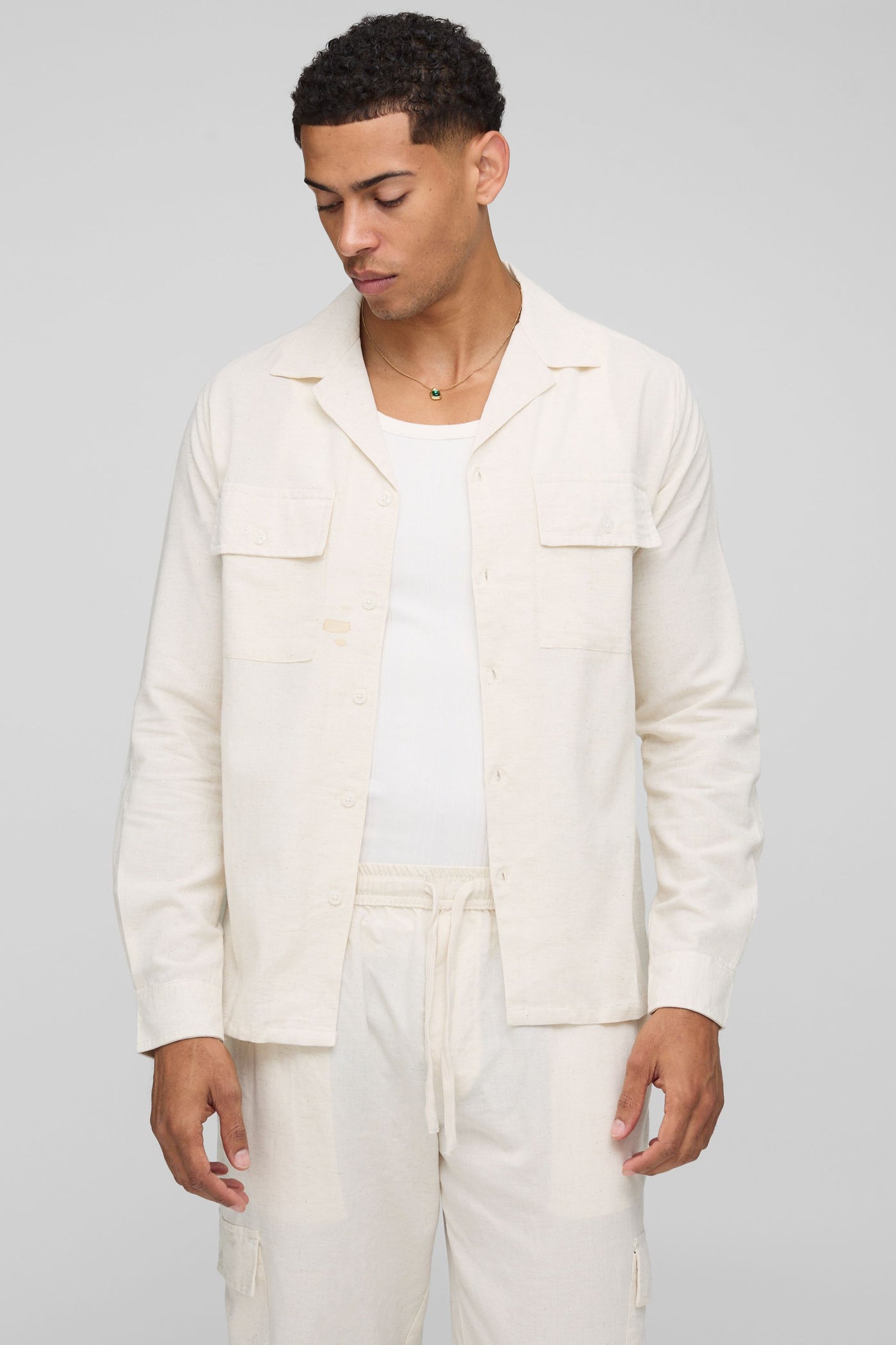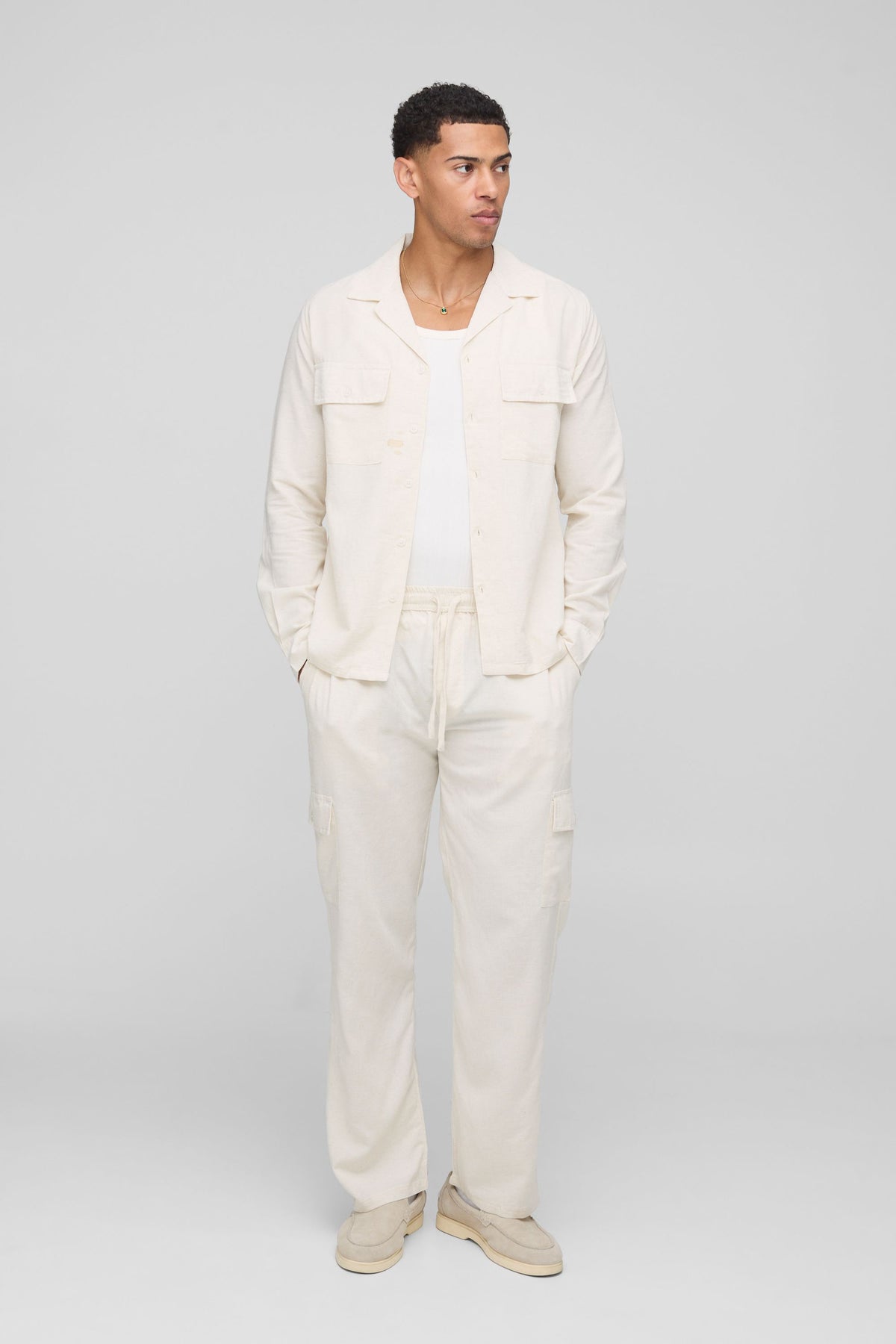 - Coordinated linen-blend shirt and trouser set - Long-sleeved shirt with revere collar and utility-inspired chest pockets - Straight-fit trousers with side cargo pockets - Versatile two-piece ensemble for effortless styling - Breathable fabric composition ideal for warmer weather Embrace laid-back sophistication with this coordinated shirt and trouser set from boohooMAN. The long-sleeved shirt, featuring a relaxed revere collar and practical chest pockets, pairs seamlessly with the straight-fit trousers adorned with cargo-style side pockets. This ensemble offers a perfect balance of comfort and style, making it a versatile choice for various casual occasions. Whether you're heading to a family barbecue or a relaxed evening out with mates, this set has you covered. Style it with minimalist trainers and a leather watch for a smart-casual look, or dress it down with sandals for a beachside stroll. The breathable fabric blend ensures you'll stay cool and comfortable, while the coordinated design takes the guesswork out of outfit planning. It's an essential addition to any fashion-forward gent's wardrobe, embodying the urban, trend-conscious spirit that boohooMAN is known for.Discover Long Sleeve Linen Blend Cargo Shirt & Trouser available to buy online at us.boohoo.com. Available with quick delivery and easy return options. Shop now!Discover Long Sleeve Linen Blend Cargo Shirt & Trouser available to buy online at us.boohoo.com. Available with quick delivery and easy return options. Shop now!