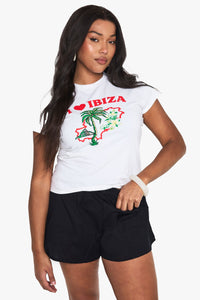 Vibrant 'Ibiza Baby' graphic print featuring palm tree and island outline