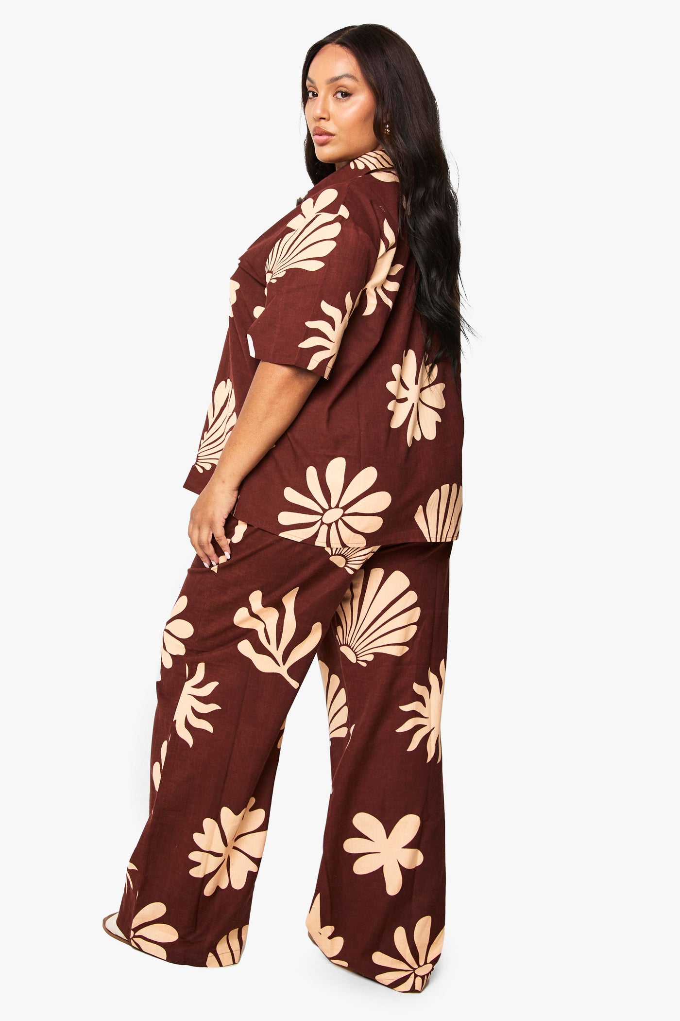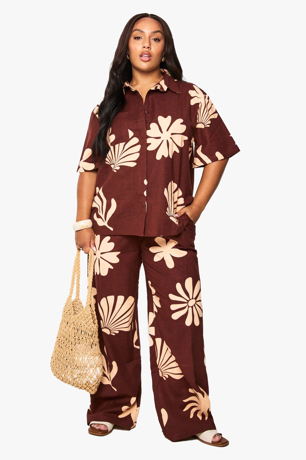 Make a splash this season with these eye-catching wide leg trousers featuring a distinctive shell print. The relaxed silhouette creates a breezy, carefree vibe that's ideal for casual outings. Style with the coordinating button-up shirt for a fashionable co-ord look, or pair with a simple vest top for a more understated ensemble. These trousers work brilliantly with flat sandals and a woven bag for daytime adventures, or dress them up with block heels for casual gatherings. The cotton fabric ensures these trousers remain comfortable throughout the day, whilst the wide leg cut allows for easy movement. Perfect for family barbecues, beach outings, or casual coffee dates, these trousers combine comfort with on-trend style for the fashion-forward woman who values both flair and functionality.Discover Plus Shell Print Linen Wide Leg Trouser available to buy online at us.boohoo.com. Available with quick delivery and easy return options. Shop now!Discover Plus Shell Print Linen Wide Leg Trouser available to buy online at us.boohoo.com. Available with quick delivery and easy return options. Shop now!