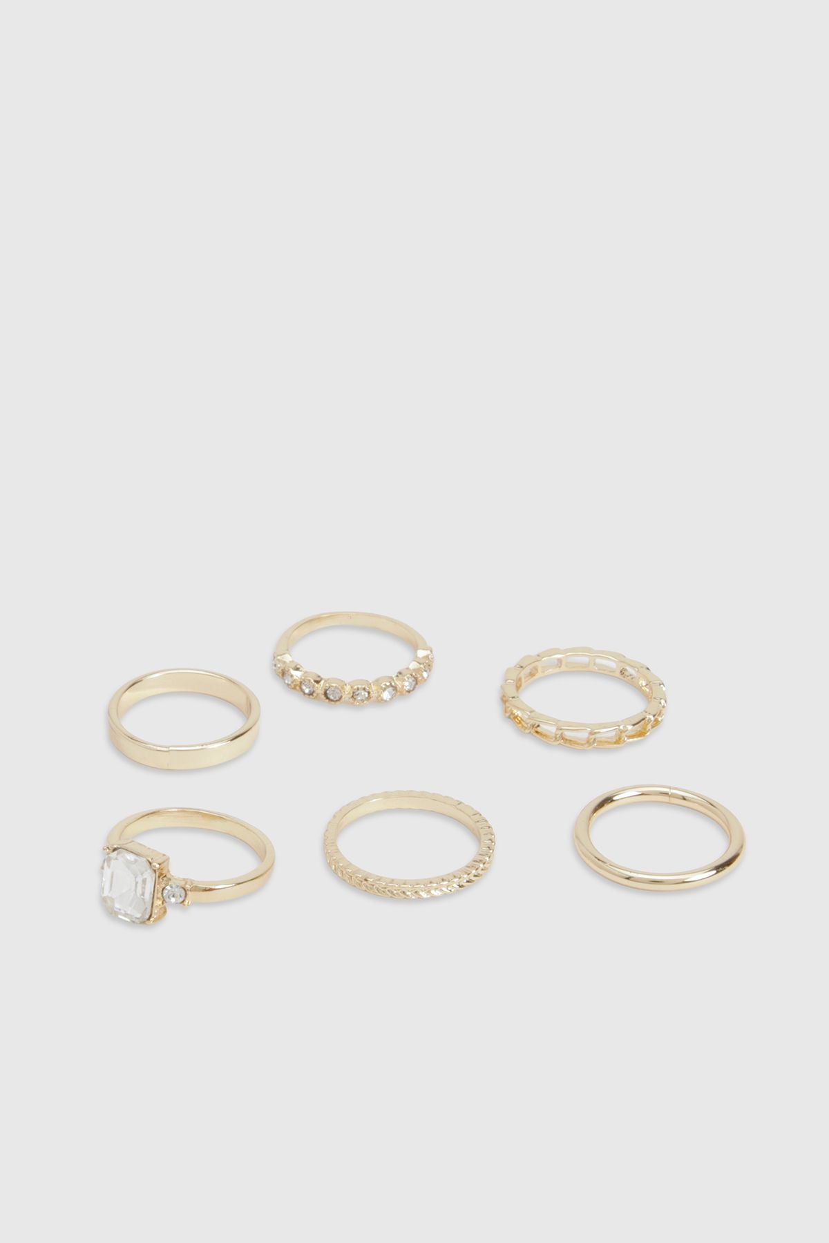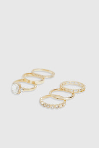 Set of six distinctive gold-tone rings featuring sparkling diamante embellishments