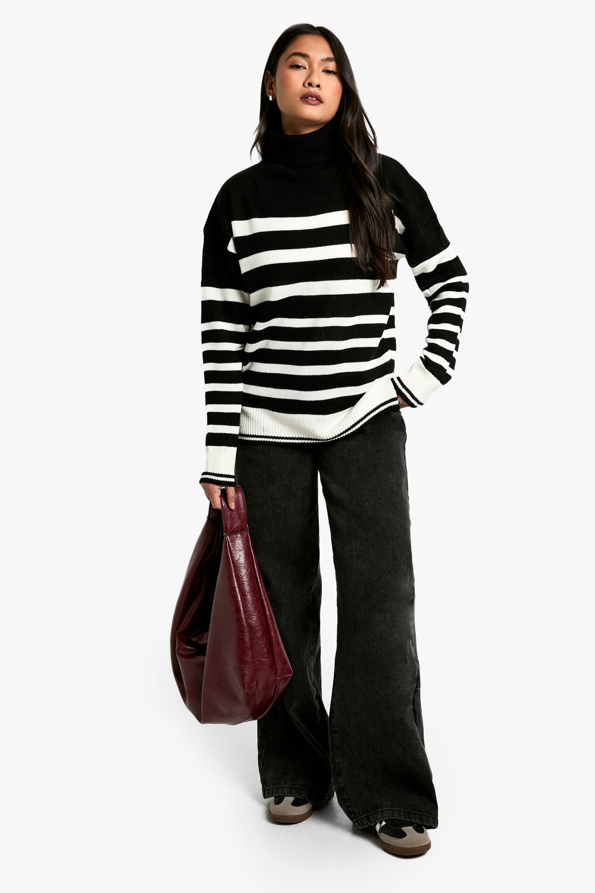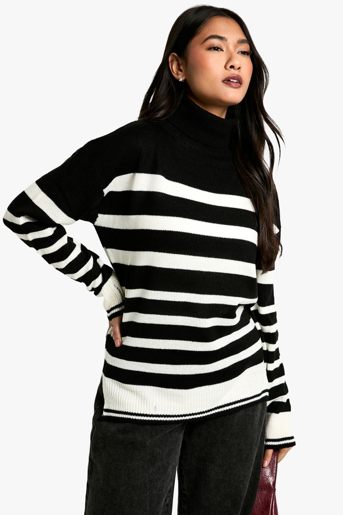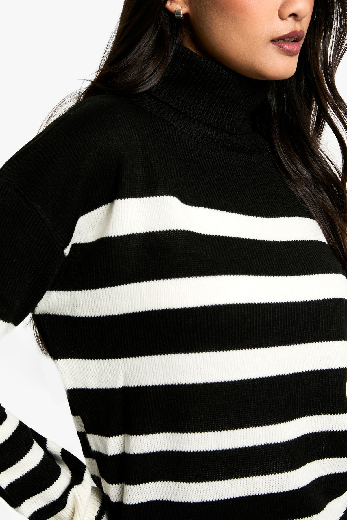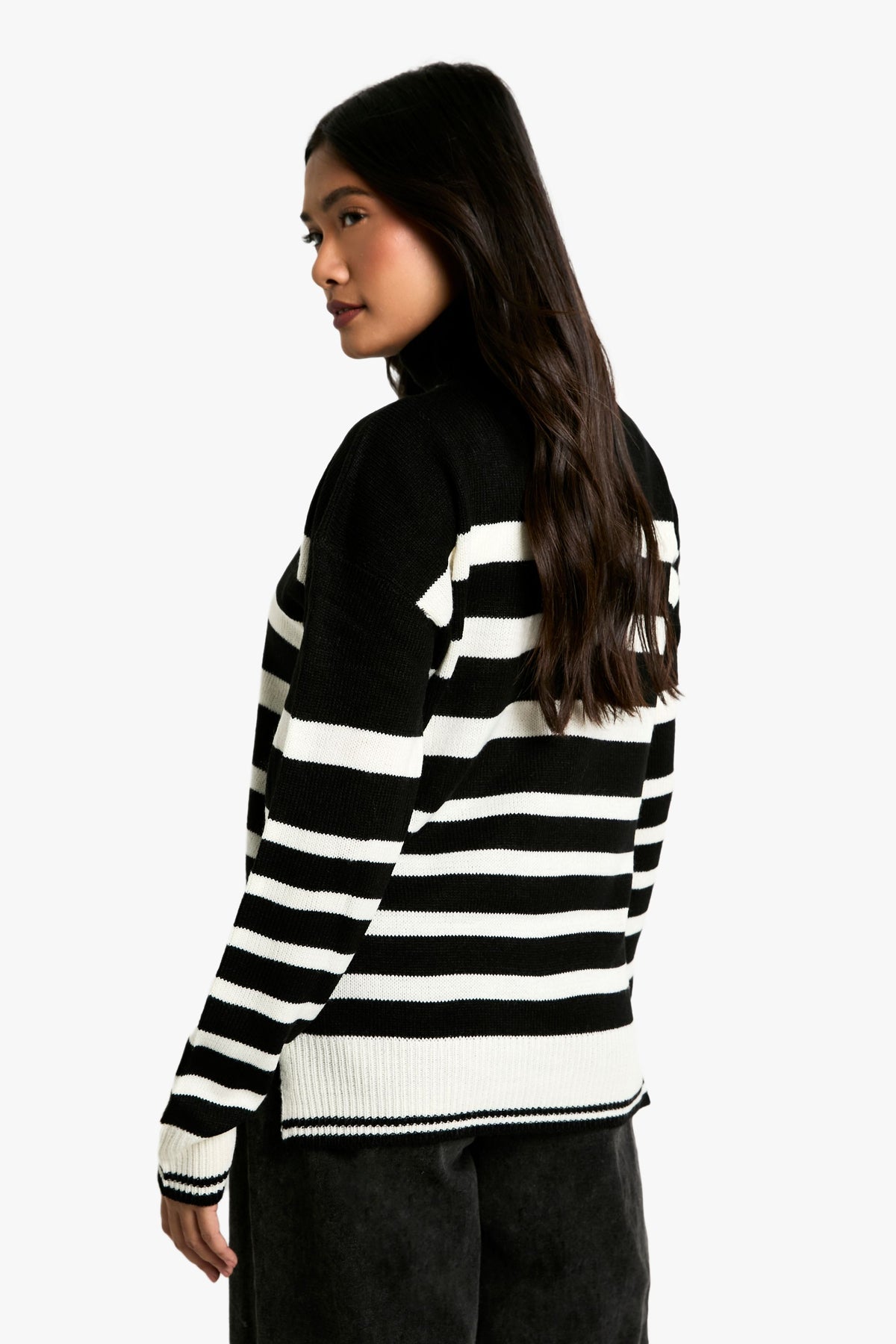 Make a statement with this eye-catching Stripe Roll Neck Jumper from Boohoo. The bold contrast between the stripes creates a captivating look that's sure to turn heads. Perfect for the fashion-forward woman who loves to stay on-trend, this jumper offers both style and comfort. The roll neck provides extra warmth on chilly days, while the relaxed fit ensures ease of movement. Style it with wide-leg trousers and chunky boots for a contemporary casual look, or pair it with a midi skirt and trainers for a chic weekend ensemble. Ideal for family gatherings, coffee dates with friends, or casual outings, this jumper is a versatile addition to your wardrobe that can be dressed up or down with ease. Its timeless design ensures it will remain a favourite for seasons to come.Discover Stripe Roll Neck Jumper available to buy online at us.boohoo.com. Available with quick delivery and easy return options. Shop now!Discover Stripe Roll Neck Jumper available to buy online at us.boohoo.com. Available with quick delivery and easy return options. Shop now!