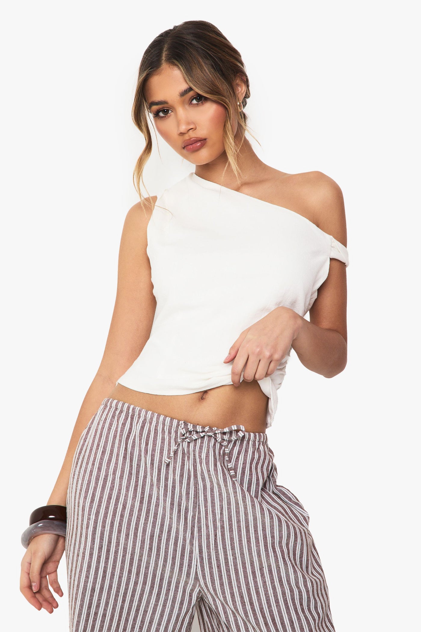 This shoulder-baring crop top combines effortless style with modern detailing for a look that's both relaxed and fashion-forward. The asymmetric neckline with its distinctive twist detail creates visual interest, whilst the cropped length pairs brilliantly with high-waisted trousers or skirts. Style it as seen with striped wide-leg trousers for casual daytime events, or dress it up with a fitted midi skirt and strappy heels for evening drinks. The linen-look texture gives this piece a summery feel that works wonderfully for garden parties or seaside holidays. For cooler evenings, layer with an oversized blazer and accessorise with statement jewellery to maintain that stylish edge. This versatile Boohoo top transitions seamlessly from family gatherings to casual brunches with friends, making it an essential addition to your warm-weather wardrobe.Discover Twist Detail Off The Shoulder Linen Look Crop Top available to buy online at us.boohoo.com. Available with quick delivery and easy return options. Shop now!Discover Twist Detail Off The Shoulder Linen Look Crop Top available to buy online at us.boohoo.com. Available with quick delivery and easy return options. Shop now!